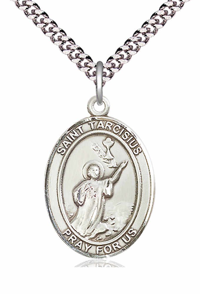 An oval shaped pendant with an image of St. Tarcisius in the center. There is a selection of chains to choose from.