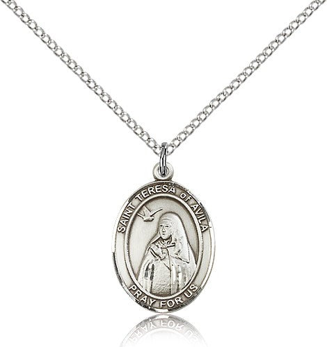St. Teresa of Avila Medal This St. Teresa of Avila Pendant is made of sterling silver and is approximately the size of a nickel. The jewelry pendant is paired with an 18 inch sterling silver light curb chain as pictured. All medals are gift boxed in a beautiful blue velvet hinged jewelry gift box.