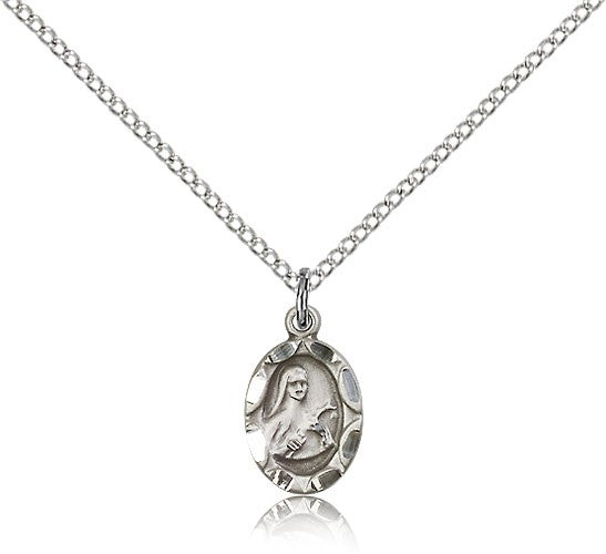 This St. Theresa Medal is paired with an 18 inch sterling silver lite curb chain as pictured. All medals are gift boxed in a light blue velvet jewelry box ready for gift giving.
