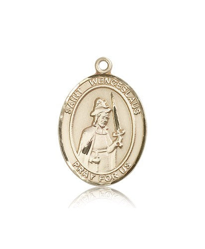 This St. Wenceslaus Pendant is made of 14 Karat Gold and is approximately the size of a quarter. The jewelry pendant is sold individually and does not come with a chain. All medals are gift boxed in a beautiful blue velvet hinged jewelry gift box.