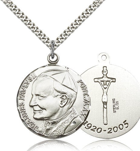 This Pope John Paul II Medal is paired with a 24 inch stainless steel heavy curb chain as pictured. All medals are gift boxed in a light blue velvet jewelry box ready for gift giving.