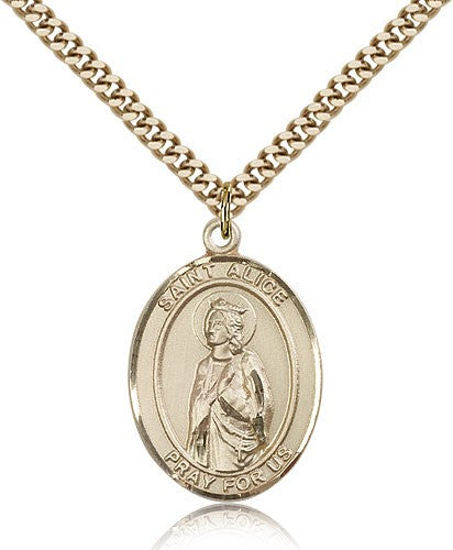 This St. Alice Pendant is made of gold filled and is approximately the size of a quarter. The jewelry pendant is paired with a 24 inch gold filled heavy curb chain as pictured. All medals are gift boxed in a beautiful blue velvet hinged jewelry gift box.