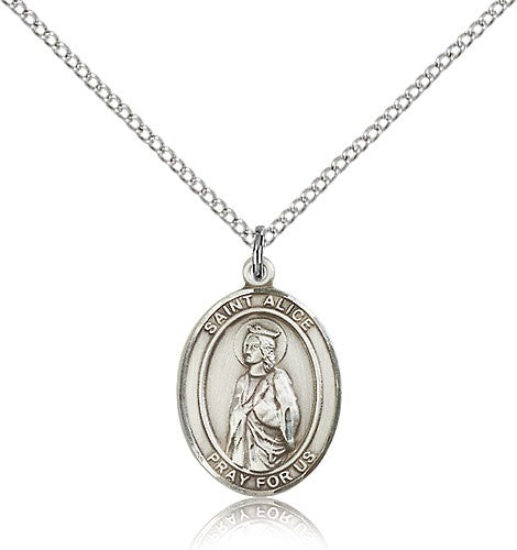 St. Alice Medal This St. Alice Pendant is made of sterling silver and is approximately the size of a nickel. The jewelry pendant is paired with an 18 inch sterling silver light curb chain as pictured. All medals are gift boxed in a beautiful blue velvet hinged jewelry gift box.