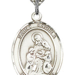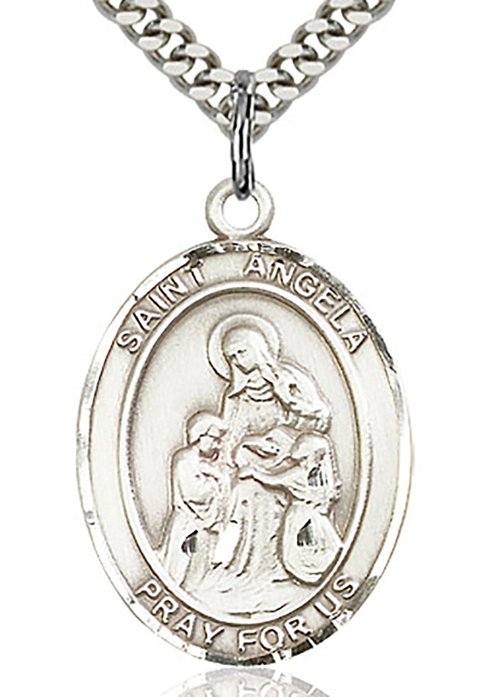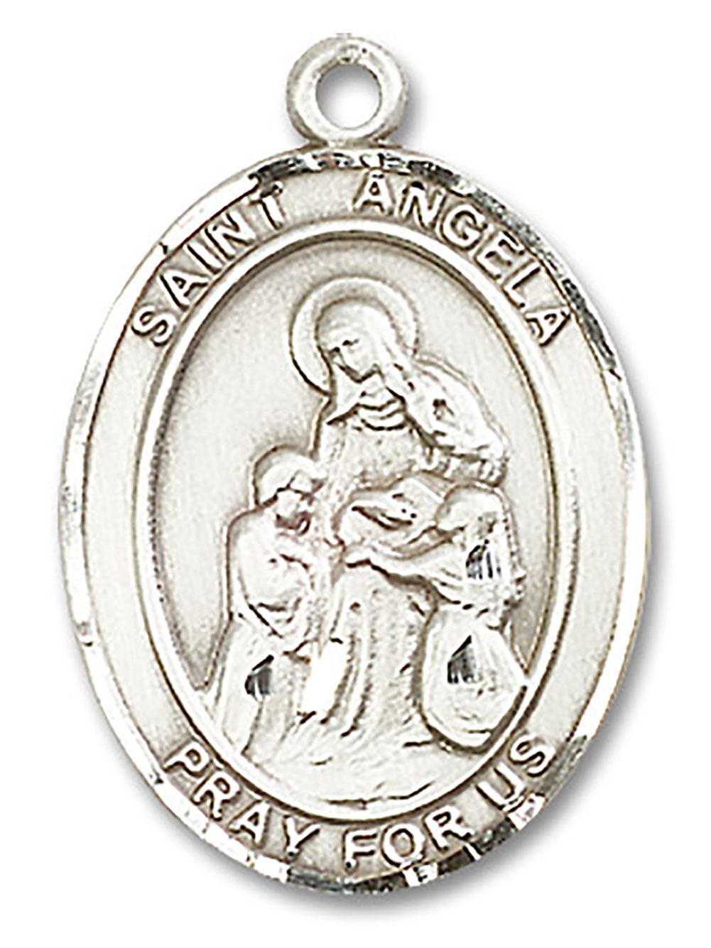 This St. Angela Merici Pendant is made of sterling silver and is approximately the size of a quarter.
