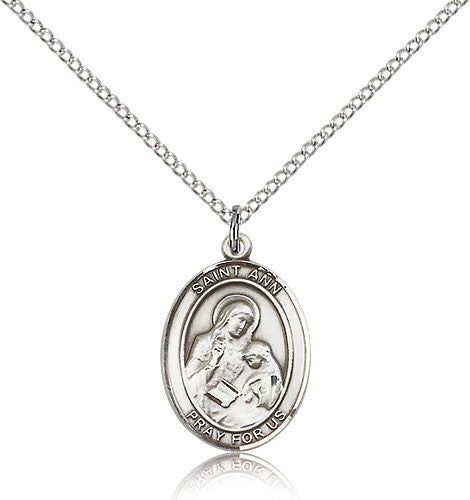 This St. Ann Pendant is made of sterling silver and is approximately the size of a nickel. The jewelry pendant is paired with an 18 inch sterling silver light curb chain as pictured. All medals are gift boxed in a beautiful blue velvet hinged jewelry gift box.