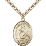 St. Charles Borromeo Medal This St. Charles Borromeo Pendant is made of gold filled and is approximately the size of a quarter. The jewelry pendant is paired with a 24 inch gold filled heavy curb chain as pictured. All medals are gift boxed in a beautiful blue velvet hinged jewelry gift box.