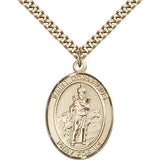 St. Cornelius Medal This St. Cornelius Pendant is made of gold filled and is approximately the size of a quarter. The jewelry pendant is paired with a 24 inch gold filled heavy curb chain as pictured. All medals are gift boxed in a beautiful blue velvet hinged jewelry gift box.