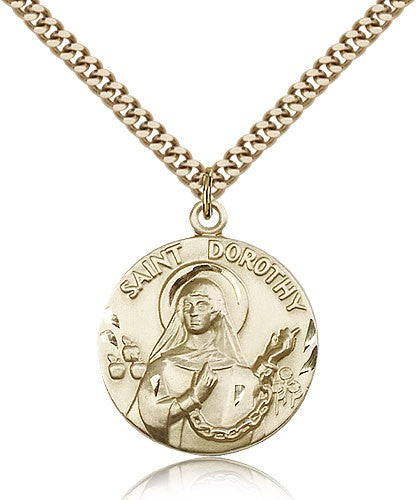 This St. Dorothy Medal is paired with a 24 inch stainless steel gold-tone heavy curb chain as pictured. All medals are gift boxed in a light blue velvet jewelry box ready for gift giving.