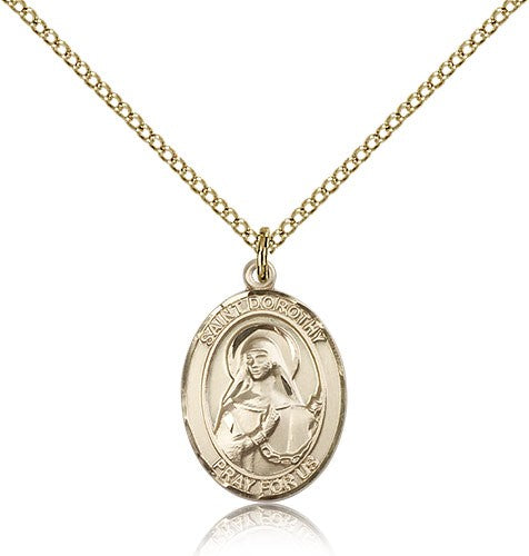 This St. Dorothy Pendant is made of gold filled and is approximately the size of a nickel. The jewelry pendant is paired with an 18 inch gold filled light curb chain as pictured. All medals are gift boxed in a beautiful blue velvet hinged jewelry gift box.