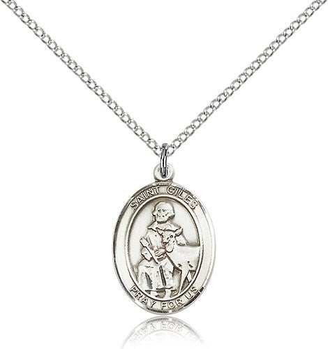 This St. Giles Pendant is made of sterling silver and is approximately the size of a nickel. The jewelry pendant is paired with an 18 inch sterling silver light curb chain as pictured. All medals are gift boxed in a beautiful blue velvet hinged jewelry gift box.