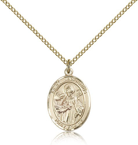 St. Januarius Medal This St. Januarius Pendant is made of gold filled and is approximately the size of a nickel. The jewelry pendant is paired with an 18 inch gold filled light curb chain as pictured. All medals are gift boxed in a beautiful blue velvet hinged jewelry gift box.