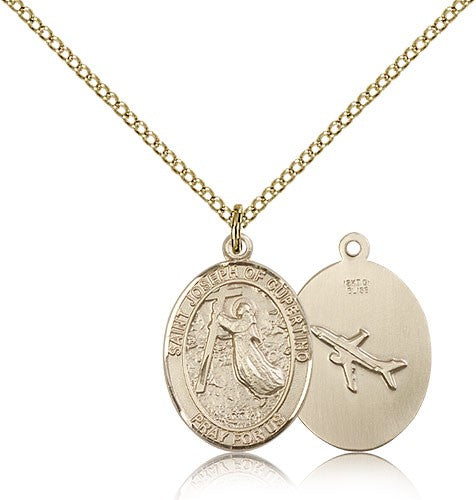 St. Joseph of Cupertino Medal This St. Joseph of Cupertino Pendant is made of gold filled and is approximately the size of a nickel. The jewelry pendant is paired with an 18 inch gold filled light curb chain as pictured. All medals are gift boxed in a beautiful blue velvet hinged jewelry gift box.