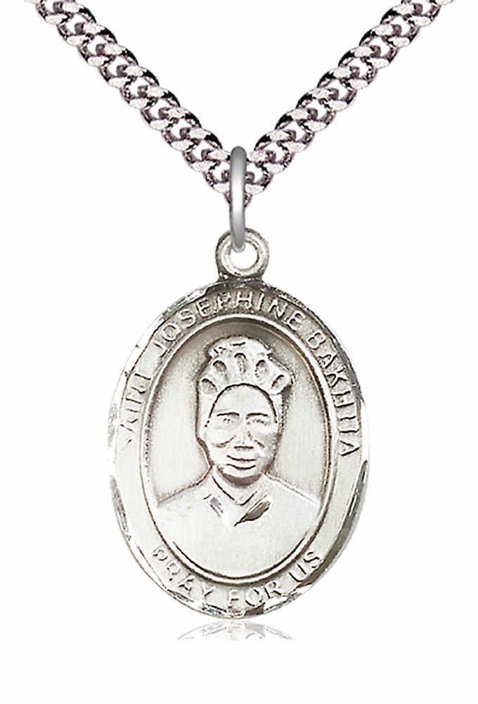 An oval shaped pendant with an image of St. Josephine Bakhita in the center. There is a selection of chains to choose from.