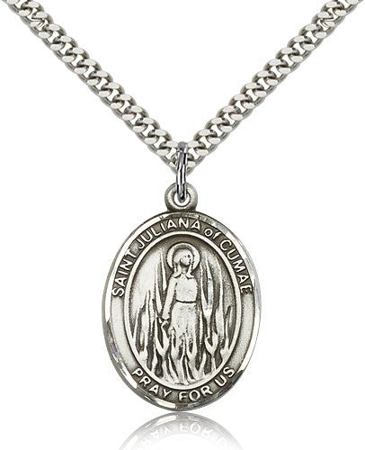 This St. Juliana Pendant is made of sterling silver and is approximately the size of a quarter. The jewelry pendant is paired with a 24 inch stainless steel heavy curb chain as pictured. All medals are gift boxed in a beautiful blue velvet hinged jewelry gift box.