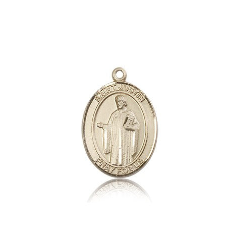 This St. Justin Pendant is made of 14 Karat Gold and is approximately the size of a nickel. The jewelry pendant is sold individually and does not come with a chain. All medals are gift boxed in a beautiful blue velvet hinged jewelry gift box.