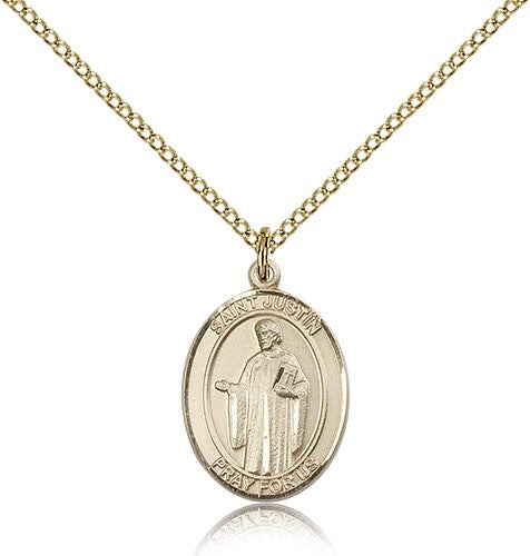 St. Justin Medal This St. Justin Pendant is made of gold filled and is approximately the size of a nickel. The jewelry pendant is paired with an 18 inch gold filled light curb chain as pictured. All medals are gift boxed in a beautiful blue velvet hinged jewelry gift box.