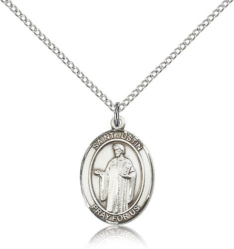 This St. Justin Pendant is made of sterling silver and is approximately the size of a nickel. The jewelry pendant is paired with an 18 inch sterling silver light curb chain as pictured. All medals are gift boxed in a beautiful blue velvet hinged jewelry gift box.