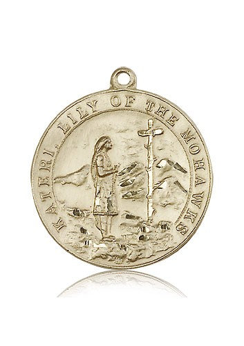 This St. Kateri Medal is made of 14 Karat Gold. The jewelry pendant is sold as pictured and does not come with a chain. All medals are gift boxed in a light blue velvet jewelry box ready for gift giving.