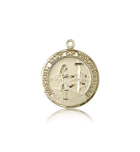 This St. Kateri Medal is made of 14 Karat Gold. The jewelry pendant is sold as pictured and does not come with a chain. All medals are gift boxed in a light blue velvet jewelry box ready for gift giving.