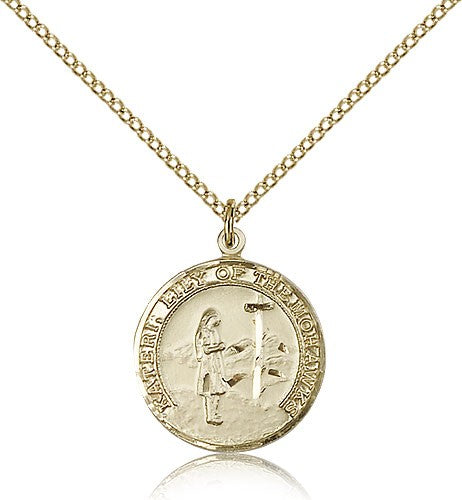 This St. Kateri Medal is paired with an 18" gold filled light curb chain as pictured. All medals are gift boxed in a light blue velvet gift box ready for gift giving.