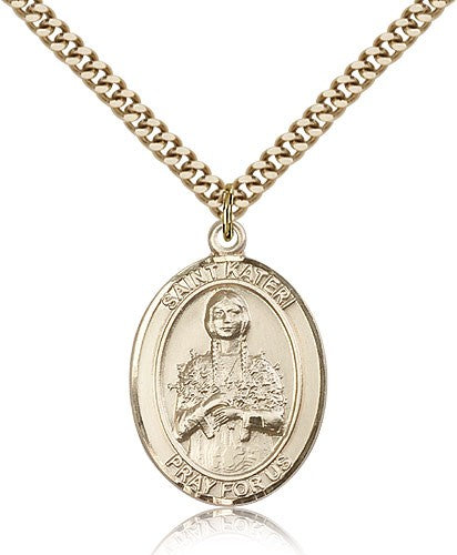 St. Kateri Medal This St. Kateri Pendant is made of gold filled and is approximately the size of a quarter. The jewelry pendant is paired with a 24 inch gold filled heavy curb chain as pictured. All medals are gift boxed in a beautiful blue velvet hinged jewelry gift box.
