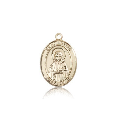 St. Lillian Medal This St. Lillian Pendant is made of 14 Karat Gold and is approximately the size of a nickel. The jewelry pendant is sold individually and does not come with a chain. All medals are gift boxed in a beautiful blue velvet hinged jewelry gift box.
