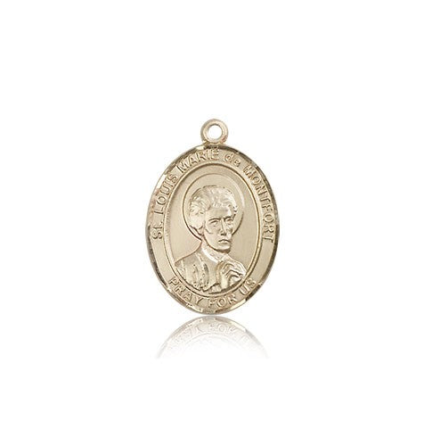 St. Louis Marie De Montfort Medal This St. Louis Marie De Montfort Pendant is made of 14 Karat Gold and is approximately the size of a nickel. The jewelry pendant is sold individually and does not come with a chain. All medals are gift boxed in a beautiful blue velvet hinged jewelry gift box.