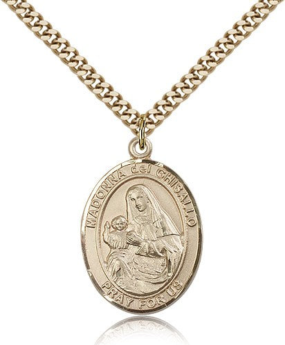 St. Madonna Del Ghisallo Medal This St. Madonna Del Ghisallo Pendant is made of gold filled and is approximately the size of a quarter. The jewelry pendant is paired with a 24 inch gold filled heavy curb chain as pictured. All medals are gift boxed in a beautiful blue velvet hinged jewelry gift box.