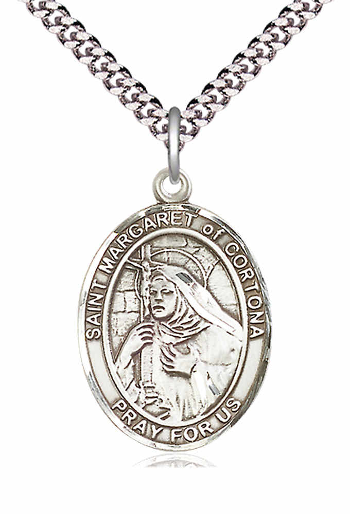 An oval shaped pendant with an image of St. Margaret of Cortona in the center. There is a selection of chains to choose from.