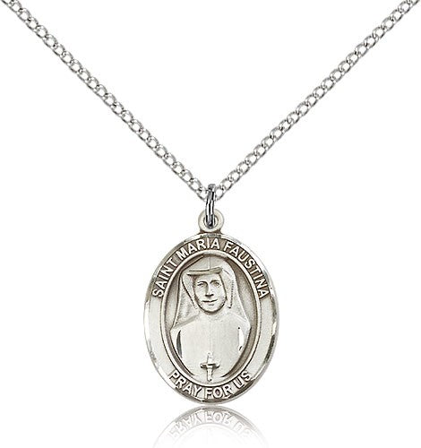 St. Maria Faustina Medal This St. Maria Faustina Pendant is made of sterling silver and is approximately the size of a nickel. The jewelry pendant is paired with an 18 inch sterling silver light curb chain as pictured. All medals are gift boxed in a beautiful blue velvet hinged jewelry gift box.