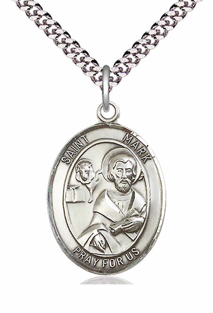 An oval shaped pendant with an image of St. Mark the Evangelist in the center. There is a selection of chains to choose from.
