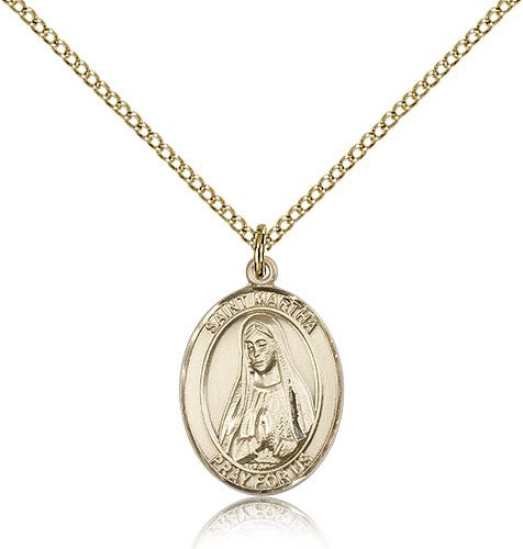 This St. Martha Pendant is made of gold filled and is approximately the size of a nickel. The jewelry pendant is paired with an 18 inch gold filled light curb chain as pictured. All medals are gift boxed in a beautiful blue velvet hinged jewelry gift box.