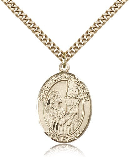 This St. Mary Magdalene Pendant is made of gold filled and is approximately the size of a quarter. The jewelry pendant is paired with a 24 inch gold filled heavy curb chain as pictured. All medals are gift boxed in a beautiful blue velvet hinged jewelry gift box.