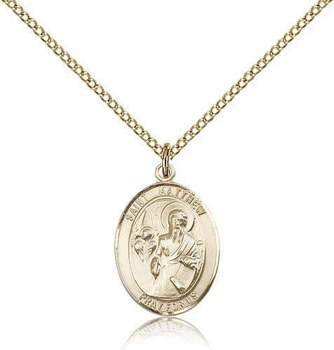 St. Matthew the Apostle Medal This St. Matthew the Apostle Pendant is made of gold filled and is approximately the size of a nickel. The jewelry pendant is paired with an 18 inch gold filled light curb chain as pictured. All medals are gift boxed in a beautiful blue velvet hinged jewelry gift box.