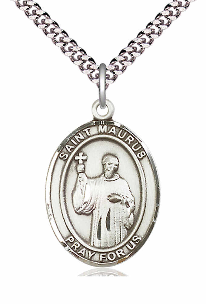 An oval shaped pendant with an image of St. Maurus in the center. There is a selection of chains to choose from.