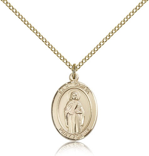 This St. Odilia Pendant is made of gold filled and is approximately the size of a nickel. The jewelry pendant is paired with an 18 inch gold filled light curb chain as pictured. All medals are gift boxed in a beautiful blue velvet hinged jewelry gift box.