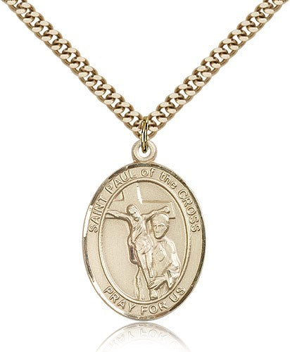 St. Paul of the Cross Medal This St. Paul of the Cross Pendant is made of gold filled and is approximately the size of a quarter. The jewelry pendant is paired with a 24 inch gold filled heavy curb chain as pictured. All medals are gift boxed in a beautiful blue velvet hinged jewelry gift box.