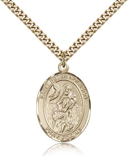 This St. Peter Nolasco Pendant is made of gold filled and is approximately the size of a quarter. The jewelry pendant is paired with a 24 inch gold filled heavy curb chain as pictured. All medals are gift boxed in a beautiful blue velvet hinged jewelry gift box.