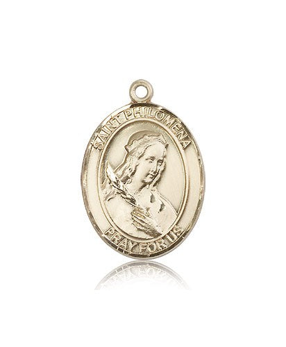 This St. Philomena Pendant is made of 14 Karat Gold and is approximately the size of a quarter. The jewelry pendant is sold individually and does not come with a chain. All medals are gift boxed in a beautiful blue velvet hinged jewelry gift box.