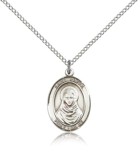 This St. Rafta Pendant is made of sterling silver and is approximately the size of a nickel. The jewelry pendant is paired with an 18 inch sterling silver light curb chain as pictured. All medals are gift boxed in a beautiful blue velvet hinged jewelry gift box.
