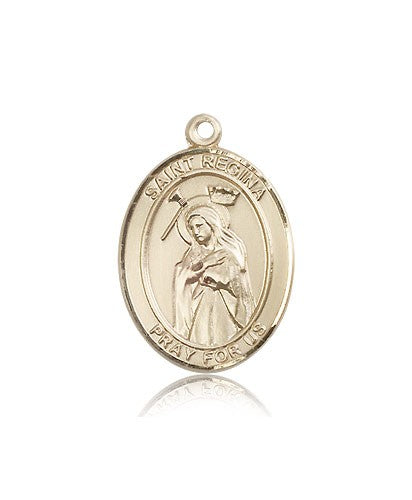 This St. Regina Pendant is made of 14 Karat Gold and is approximately the size of a quarter. The jewelry pendant is sold individually and does not come with a chain. All medals are gift boxed in a beautiful blue velvet hinged jewelry gift box.