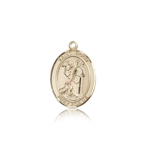 St. Roch Medal This St. Roch Pendant is made of 14 Karat Gold and is approximately the size of a nickel. The jewelry pendant is sold individually and does not come with a chain. All medals are gift boxed in a beautiful blue velvet hinged jewelry gift box.