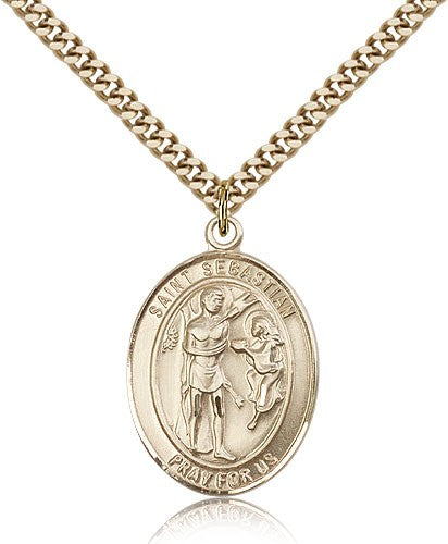 St. Sebastian Medal This St. Sebastian Pendant is made of gold filled and is approximately the size of a quarter. The jewelry pendant is paired with a 24 inch gold filled heavy curb chain as pictured. All medals are gift boxed in a beautiful blue velvet hinged jewelry gift box.