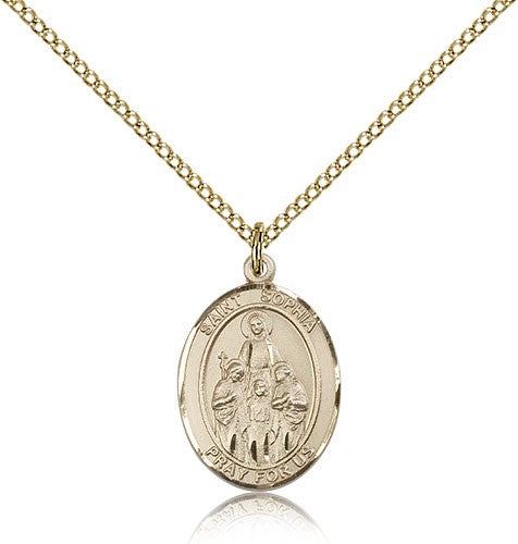 St. Sophia Medal This St. Sophia Pendant is made of gold filled and is approximately the size of a nickel. The jewelry pendant is paired with an 18 inch gold filled light curb chain as pictured. All medals are gift boxed in a beautiful blue velvet hinged jewelry gift box.