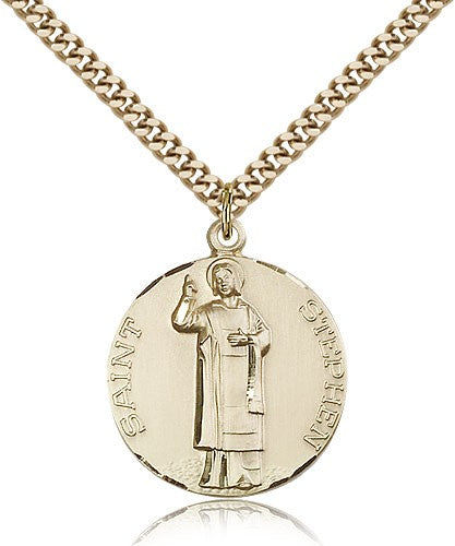 This St. Stephen Medal is paired with a 24 inch stainless steel gold-tone heavy curb chain as pictured. All medals are gift boxed in a light blue velvet jewelry box ready for gift giving.