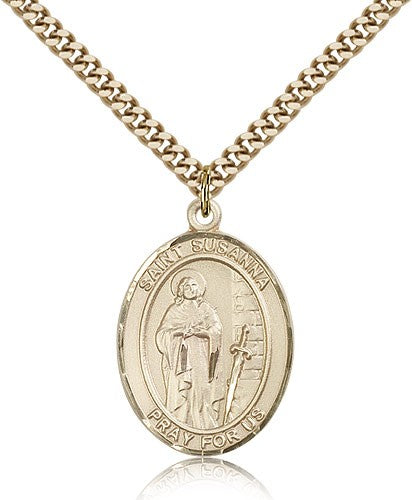 This St. Susanna Pendant is made of gold filled and is approximately the size of a quarter. The jewelry pendant is paired with a 24 inch gold filled heavy curb chain as pictured. All medals are gift boxed in a beautiful blue velvet hinged jewelry gift box.