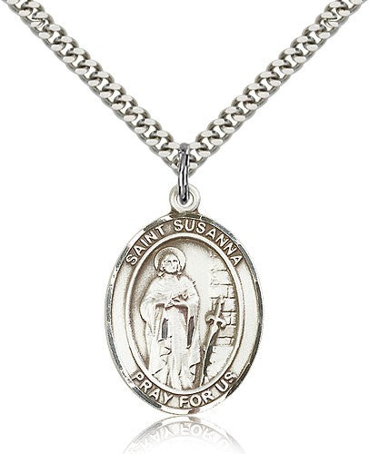 St. Susanna Medal This St. Susanna Pendant is made of sterling silver and is approximately the size of a quarter. The jewelry pendant is paired with a 24 inch stainless steel heavy curb chain as pictured. All medals are gift boxed in a beautiful blue velvet hinged jewelry gift box.