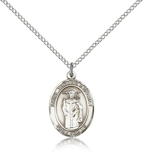St. Thomas A Becket Medal This St. Thomas A Becket Pendant is made of sterling silver and is approximately the size of a nickel. The jewelry pendant is paired with an 18 inch sterling silver light curb chain as pictured. All medals are gift boxed in a beautiful blue velvet hinged jewelry gift box.