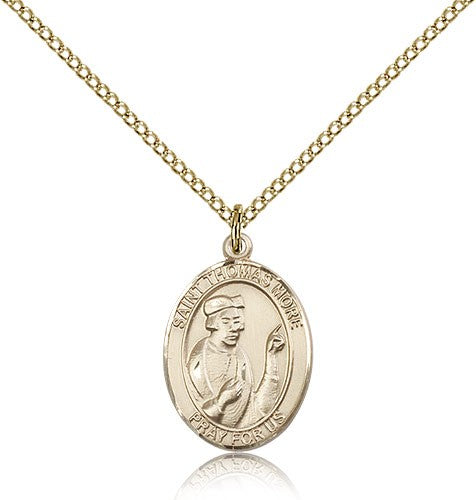 St. Thomas More Medal This St. Thomas More Pendant is made of gold filled and is approximately the size of a nickel. The jewelry pendant is paired with an 18 inch gold filled light curb chain as pictured. All medals are gift boxed in a beautiful blue velvet hinged jewelry gift box.