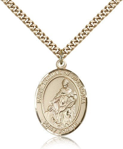 St. Thomas of Villanova Medal This St. Thomas of Villanova Pendant is made of gold filled and is approximately the size of a quarter. The jewelry pendant is paired with a 24 inch gold filled heavy curb chain as pictured. All medals are gift boxed in a beautiful blue velvet hinged jewelry gift box.